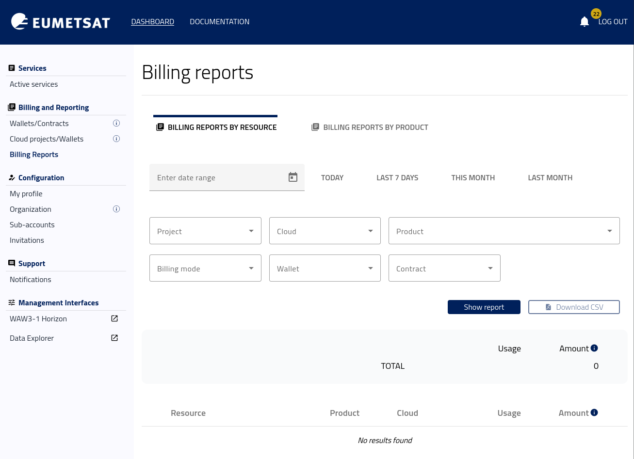 Enter the Dashboard via https://eumetsat.cloudferro.com/ and click on Billing and Reporting -> Billing Reports. This is the starting form to enter the data into: