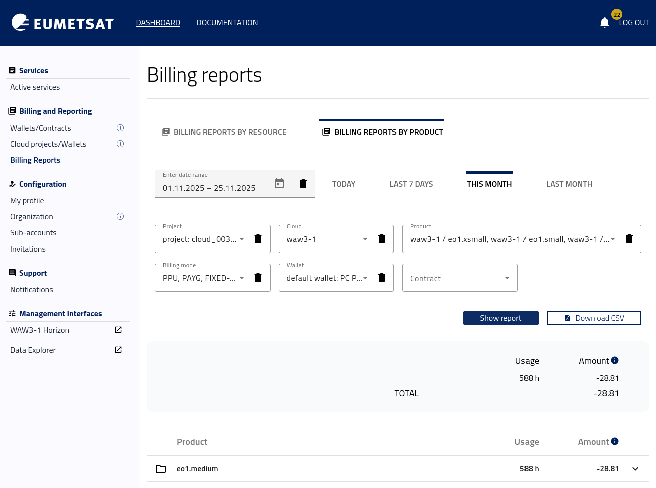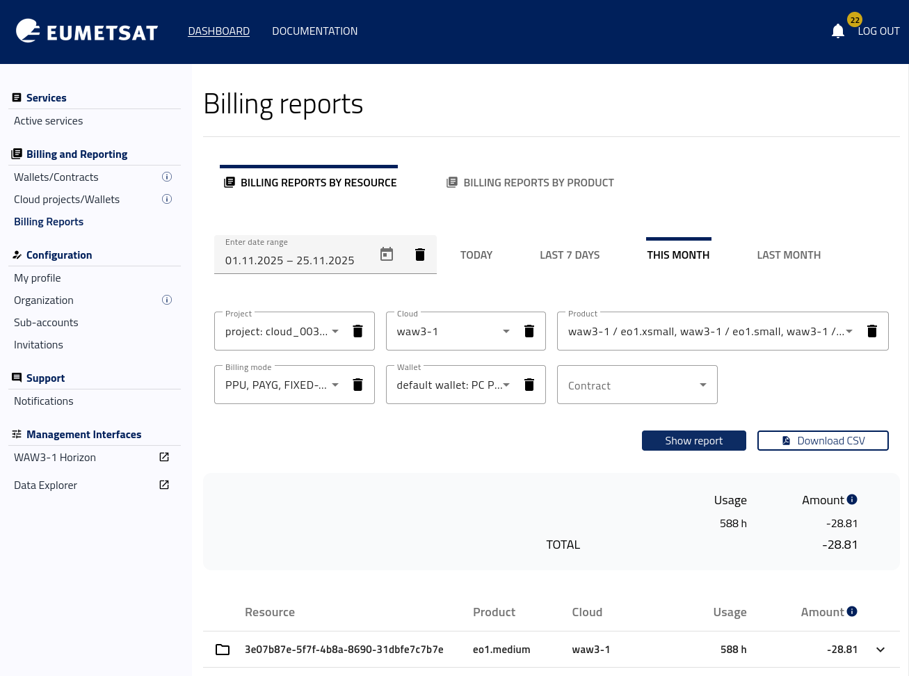 Monitoring cloud costs regularly helps you manage resource consumption and optimize spending. In the Eumetsat Elasticity Dashboard, under Billing and Reporting → Billing Reports, you can view your usage and costs in two distinct ways: